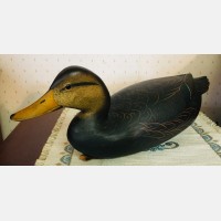 Over-sized black duck carved by Bob White, Tullytown, Pa. Hollow carved with beautiful original scratch coat paint and relief carved wing tip tail feathers. Slightly turned head with glass eyes. Maker’s Bob White quail weight on the underside. Mint original condition. Length - 18 1/2 inches. Number one slot Folk Art.