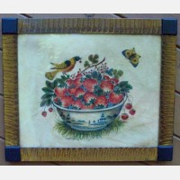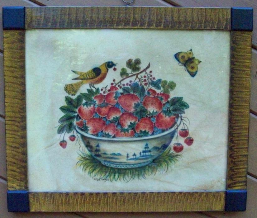Oil on velvet theorem by Ellinger (American 1913-2003). A lovely presentation with strawberries in a Canton bowl and a yellow bird and butterfly. Good crisp colors with original paint decorated frame and an undisturbed paper backing. Dimensions - 17 1/2" x 14" (sight).